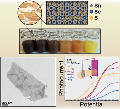 Isovalent alloying in printable metal dichalcogenide nanomaterials enables precise, application-targeted property tuning. However, a scalable platform offering broad optical and electrical tunability has so far remained elusive. Herein, we establish a powder-based, solution-processed route to access the full domain of SnSxSe(2-x) alloy nanosheets, providing control over a wide range of properties through chalcogenide composition. The n-type nanosheet alloy series shows a wide spread in optical and in-plane electrical properties, ranging from 1.67 eV and low bandgap metallic-like behavior for 2D SnSe2, to 2.46 eV and wide bandgap semiconducting behavior with high-resistivity for 2D SnS2. The out-of-plane conductivity is also tunable, showing nonmonotonic behavior with an optimal chalcogenide ratio of x = 1.2 – 1.6. Using photoelectrochemistry as an example, we highlight how the interplay of these tunable properties enables optimized performance for targeted applications. The exceptional range of tailorable properties reported here provides a roadmap for tuning these alloys, thereby opening avenues for their potential application in a multitude of fields.